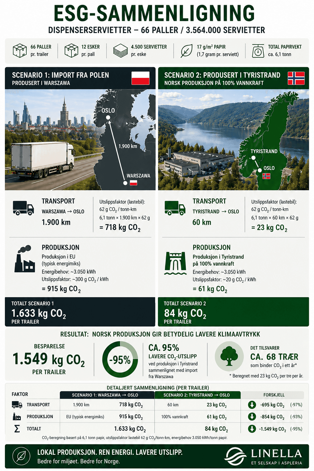 Hvert trailerlass med norskproduserte dispenserservietter reduserer CO₂-utslipp tilsvarende opptaket fra ca. 68 trær per år.
